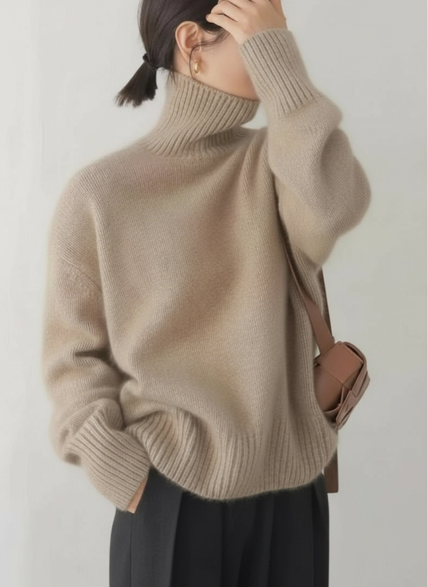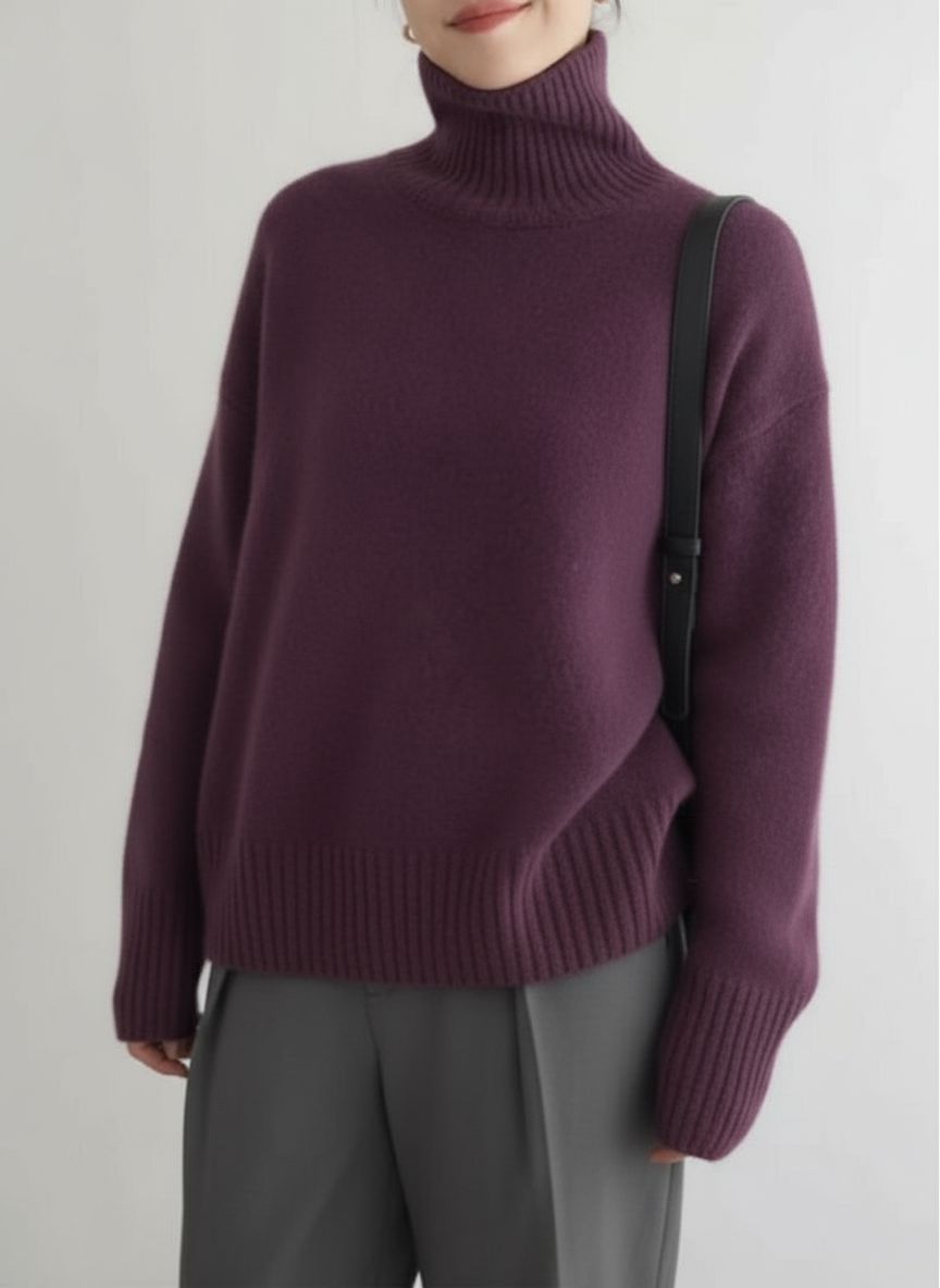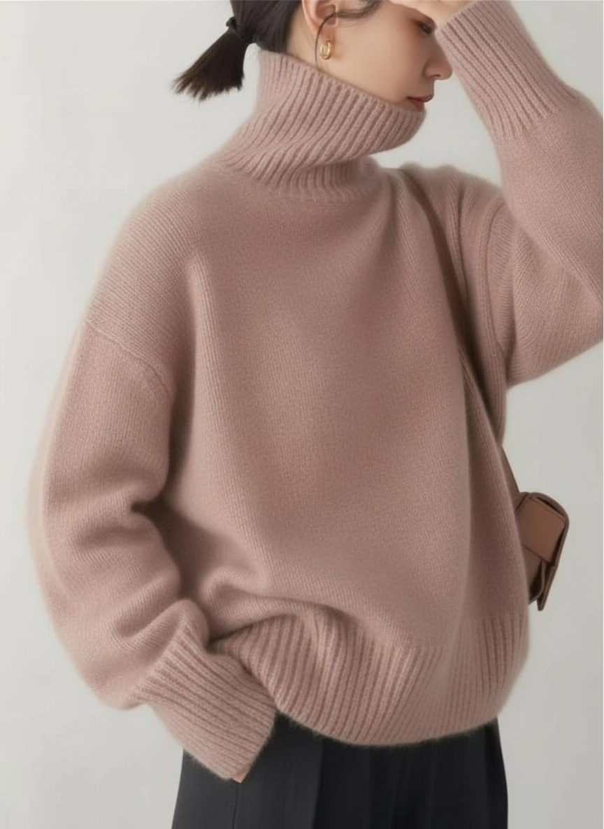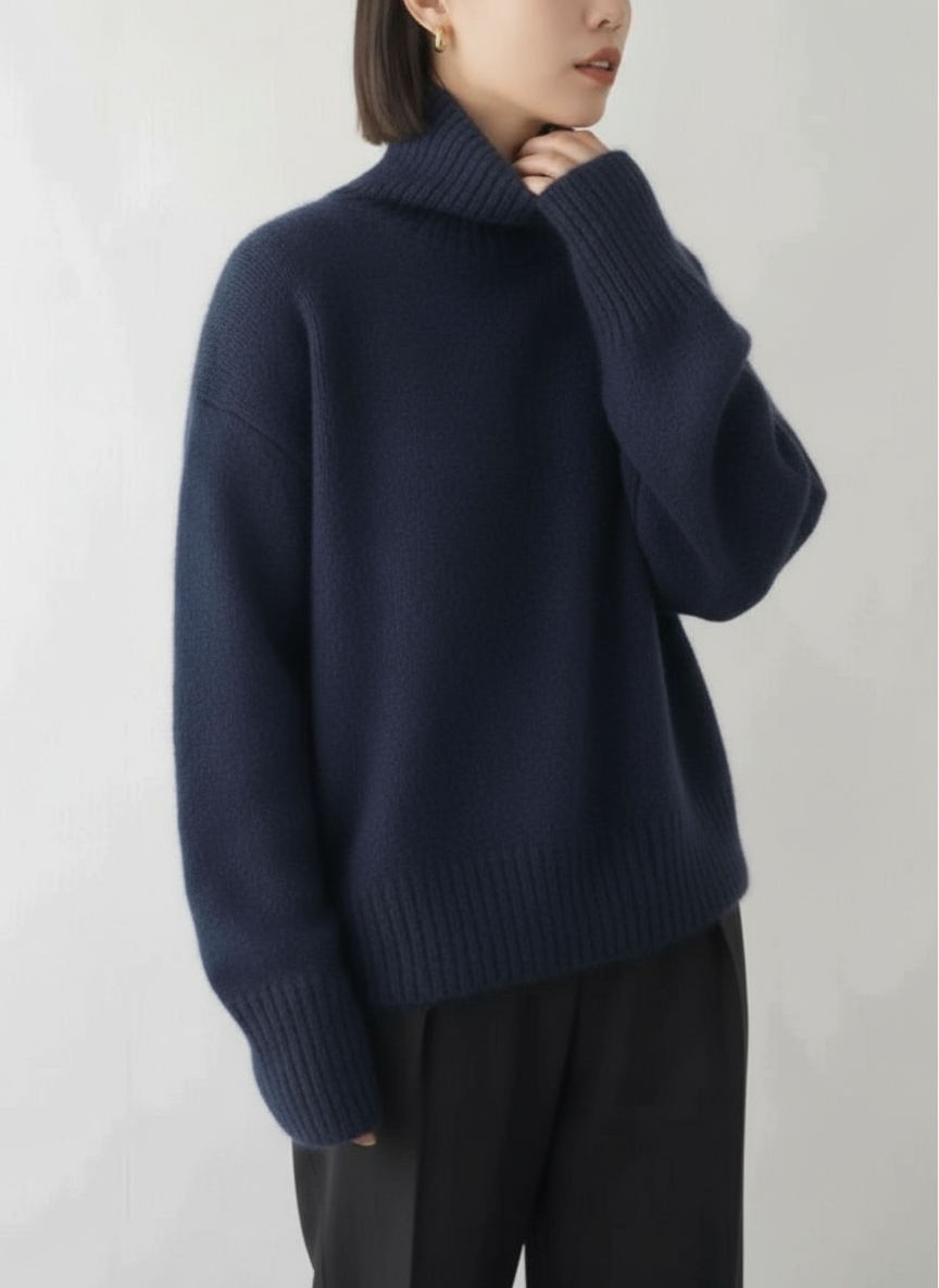 100 % ren kashmir – utrolig blød, varm og behagelig mod huden. Den høje rullekrave og det klassiske snit giver et tidløst udtryk, der passer både til hverdag og mere elegante anledninger.