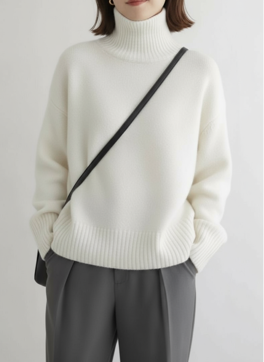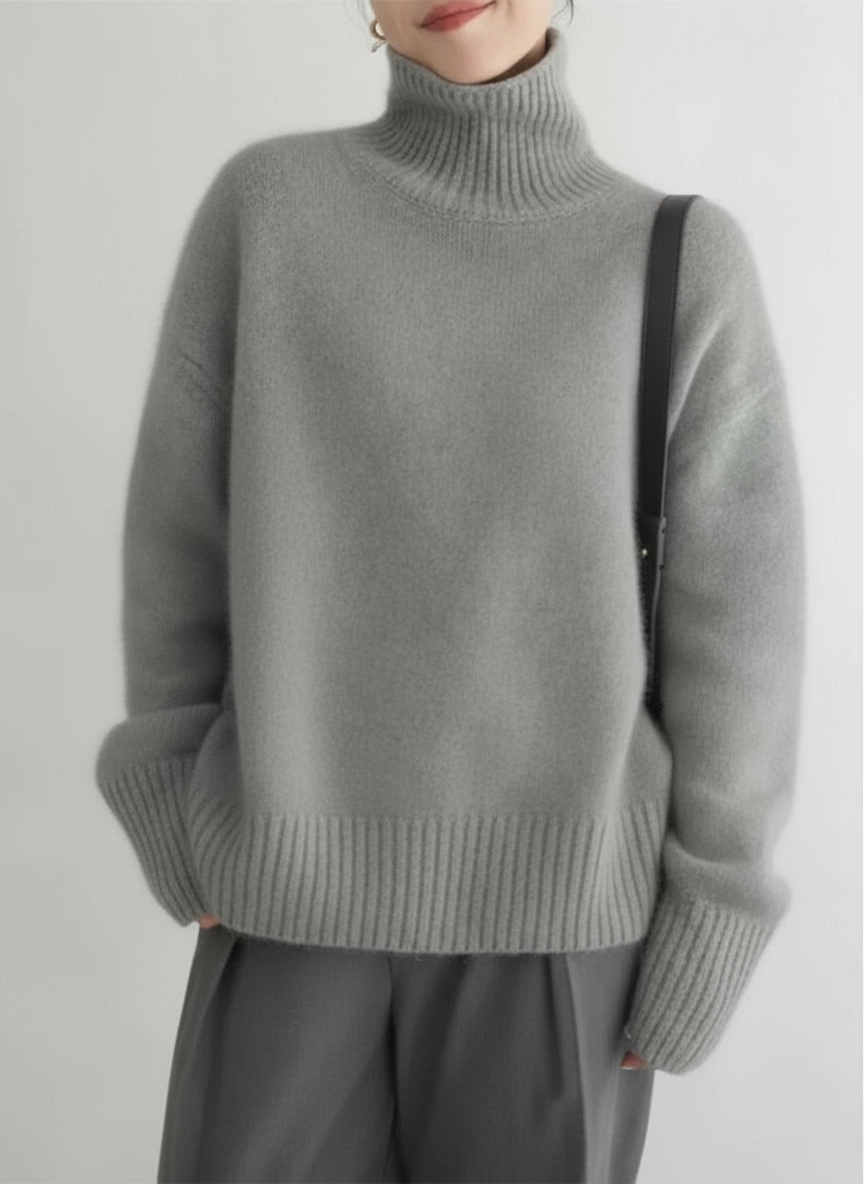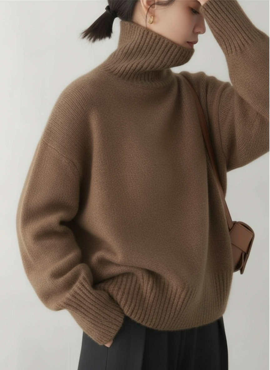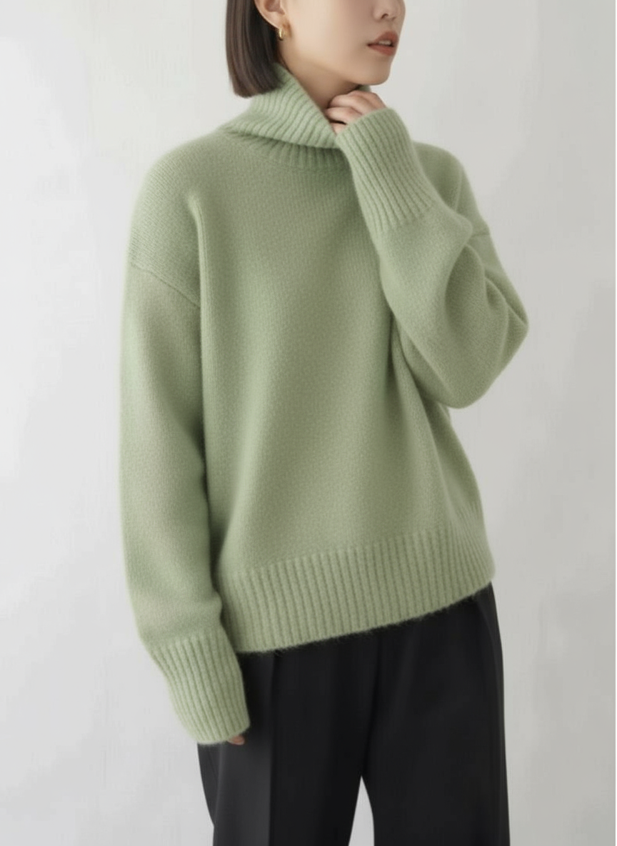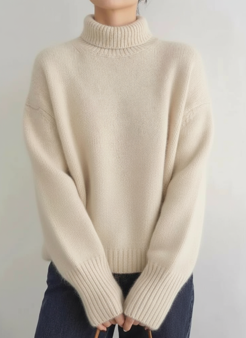 100 % ren kashmir – utrolig blød, varm og behagelig mod huden. Den høje rullekrave og det klassiske snit giver et tidløst udtryk, der passer både til hverdag og mere elegante anledninger.